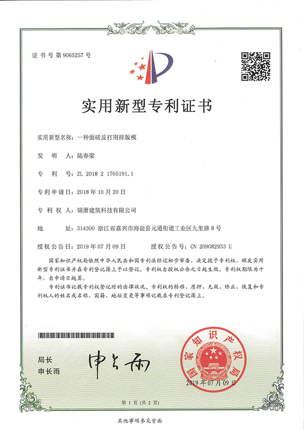 专利证书-一种面砖反打用排版模